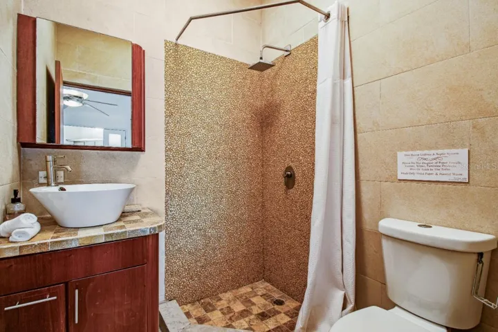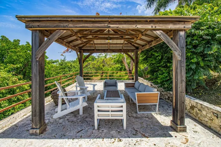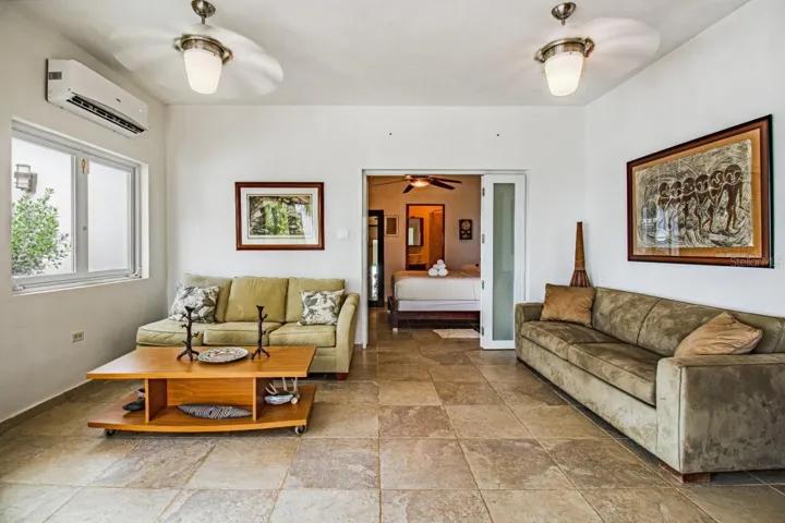 This is a two-level home with two separate gazebos. On the first floor (entrance), you'll find a fully equipped kitchen that seats up to 10, with two 33-bottle wine coolers and a double oven. Each room has its private entrance. The first floor includes 4 bedrooms, including 2 master suites: the first master suite has a king-size bed, TV, private bathroom, and chaise lounge. The second master bedroom has a king-size bed, mini fridge and microwave, private bathroom, and TV. The third bedroom features 2 bunk beds (each with a full-size bed on the bottom and a single bed on top, sleeping 6), TV, and a private bathroom. The fourth bedroom or studio has a queen-size bed, private bathroom, 2 sofas, and is adjacent to the living room with SAT/Dish and DVD player. Additional amenities include laundry facilities, an outdoor shower in the pool area, a lounge chair, large sofa, and a gas barbecue.