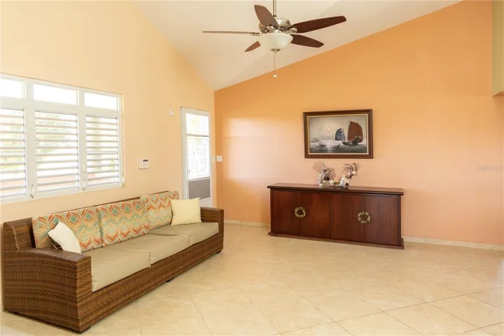 From its grand entrance in the bucolic neighborhood of Puerto Real to its vaulted interiors, this family owned residence has a stately appearance. The elegant home is set back on a hilltop and surrounded by cool trade winds, majestic views of the Caribbean, and tranquil rolling hills and meadows. The property has 1.6 acres of privacy, the land is scattered with a myriad of fruit trees, including breadfruit, mango, pigeon peas, soursop, gooseberry, lemon, and a variety of plantains and bananas.