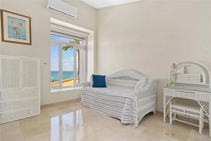 The interior is a showcase of luxury, featuring rich marble flooring that gleams under the light, intricately designed decorative recessed ceilings, and polished wood accents that add warmth and elegance to the living spaces. These indoor areas are designed to blend seamlessly with the outdoors, ensuring that the beauty of the estate’s natural setting is always in view. The master suite serves as a sanctuary of ultimate comfort and luxury, offering an ensuite bathroom equipped with both an invigorating outdoor shower and a soothing jacuzzi, embodying the pinnacle of opulent living. This estate houses five additional bedrooms, each with its unique design and panoramic views of the vibrant outdoor landscape, providing guests with their private retreats. Culinary adventures await in the state-of-the-art kitchen, which boasts dual islands, custom cabinetry, and strategically placed windows that frame the stunning ocean views, inspiring chefs and entertaining hosts alike. The dining room adjacent to the kitchen is designed for hosting lavish dinners, while the estate’s variety of outdoor settings offers intimate and versatile spaces for entertaining, including a poolside area with an outdoor kitchen that allows guests to dine al fresco while soaking in the lush resort atmosphere. The estate’s Mediterranean-inspired design, characterized by its majestic columns and balustrades set against the backdrop of the garden’s vibrant colors, creates a serene yet elegant ambiance, inviting relaxation and enjoyment. With a generous 6,370 square feet of living space and covered parking, this estate grants access to the luxurious amenities of Palmas del Mar, including a tennis center, equestrian center, private schooling options, two championship golf courses, sixteen restaurants and cafes, and the exclusive marina and yacht club, placing it as a rare gem on the east coast of Puerto Rico.