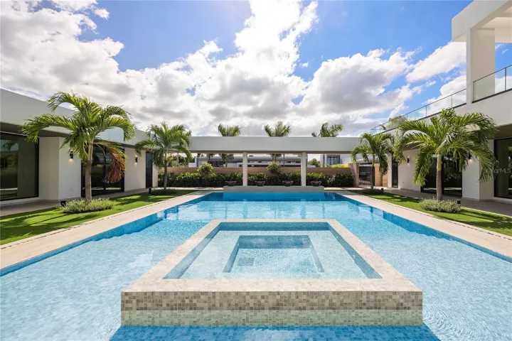 The home is equipped with premium upgrades throughout, including a Culligan water softener, ceiling speakers, sound bars, and subwoofers for an immersive audio experience. Doors and windows by Alumni from the Durabella Group combine elegance with durability. The property’s thoughtful infrastructure includes an 800-gallon cistern and a 300-gallon irrigation system to support sustainable water management. The upper level feels like a home within a home, featuring three additional bedrooms, a family room, a second laundry room, and two terraces—one covered with views of the courtyard and another open-air terrace overlooking the surrounding mountains. Designed for relaxation and entertaining, the outdoor spaces include expansive covered terraces, a large pool, a convenient pool bath, and an outdoor shower nestled within lush landscaping on a 2,500-square-meter (26,909 sq. ft.) lot. A three-car garage with a golf cart bay and extra storage completes the home. This exquisite property is more than just a residence—it’s a luxurious sanctuary designed for family connection and entertaining on the beautiful island of Puerto Rico