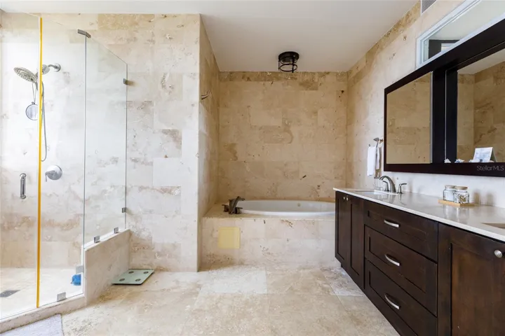 Bright and airy living spaces with travertine floors, marble and granite countertops, and solid wood cabinets.