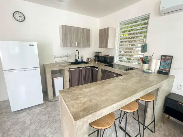 The kitchen is built with practical concrete counters and a connected island, perfect for chopping fruit in the morning or mixing cocktails in the evening. The barstools make it an easy gathering place, whether you’re cooking, working remotely, or hosting friends. Each of the three bedrooms is fitted with air conditioning, ensuring restful sleep no matter the season. The home also includes a washer and dryer, and a dedicated owner’s closet adds a layer of convenience and security for those who plan to rent it out.\r\n