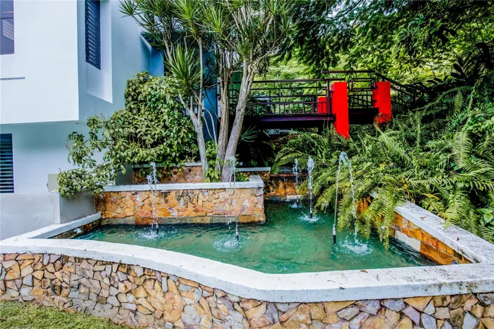 Outdoors, you’ll find a fully fenced, professionally landscaped lot positioned several feet above neighboring homes—ensuring both privacy and panoramic garden views. A custom water fountain and walking bridge lead to the grand entry, framed by mature fruit trees and native flora.\r\n