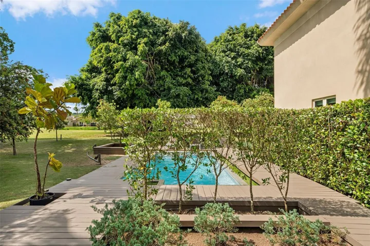 With 4 spacious bedrooms and 3.5 bathrooms, the layout is ideal for both family life and entertaining. Each space has been designed with acoustic clarity in mind — perfect for those who appreciate refined interiors where sound and silence are part of the atmosphere. The home opens out to a fully decked and landscaped patio, centered around a gorgeous pool and framed by tranquil views of the golf course and nearby pond. It’s a serene and private outdoor escape, ideal for quiet mornings or sunset gatherings.