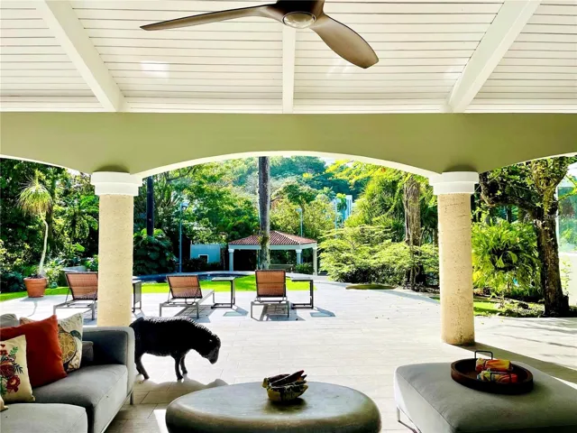 +"PublicRemarks": "Enjoy living in this tropical Paradise, in your own private resort on a hilltop overlooking San Juan and the ocean in the distance, and yet only 6 miles from San Juan. This impressive 7,538 S/M luxurious estate is a true oasis surrounded by lush gardens and century old trees. The residence boasts magnificent marble floors throughout, majestic cathedral ceilings in the commanding Great Room, a chef's kitchen with top of the line appliances opening up to a modern dining room and a huge covered terrace, great for entertaining, and all overlooking the pool, tennis court (being renovated), a fire pit, a gazebo, a bar and wine room. The home also features an office or library, a large fully equipped media family room, also all overlooking the terrace, pool and tennis court. The home boasts seven bedrooms with en-suite baths, including a complete separate apartment, or guest quarter with its own entrance. An oversized laundry room, a caretaker’s bedroom (now a gym) with en-suite bath, three separate garages, a large full generator and a cistern complete this magnificent one of a kind suburban estate. Tintillo Hills is an exclusive enclave and one of the most secure double-gated communities in Guaynabo. This unique estate benefits from close proximity to Condado and Guaynabo’s best schools, restaurants, and cosmopolitan living while you indulge living in a secluded oasis, a tropical paradise, your own private resort. For qualified buyers by appointment only."