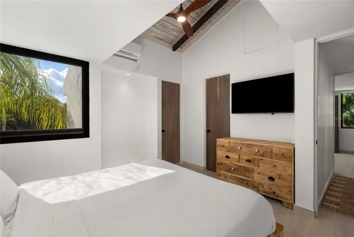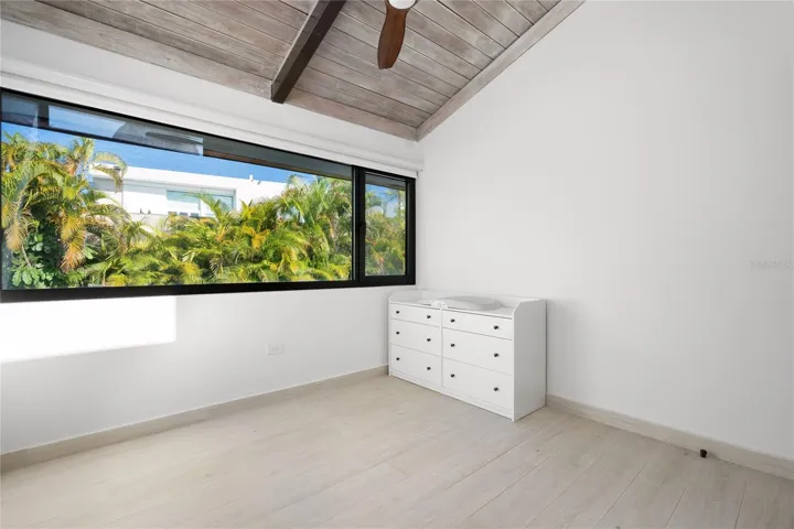 A flex guest suite doubles as a home office, complete with a Murphy bed and walk-in closet, while two additional bedrooms provide high wood ceilings, built-in shelving, and ceiling fans. The second full bath and upper-level laundry room keep daily living practical and well-organized.\r\n