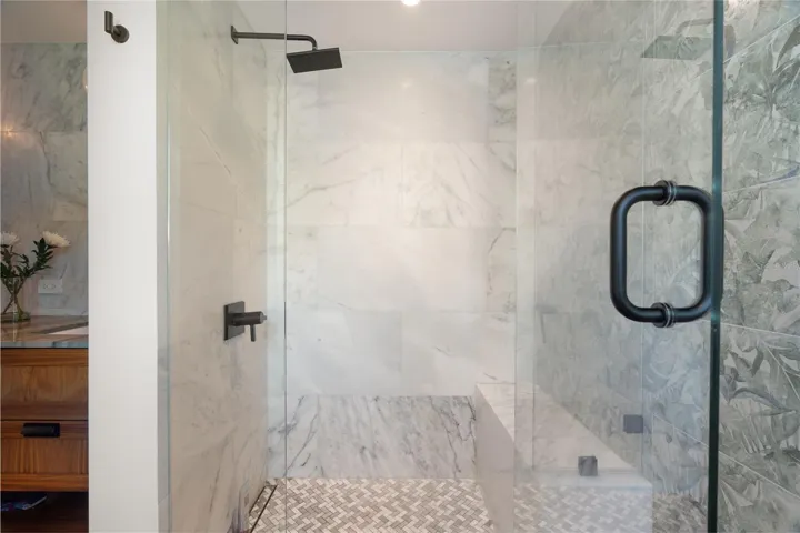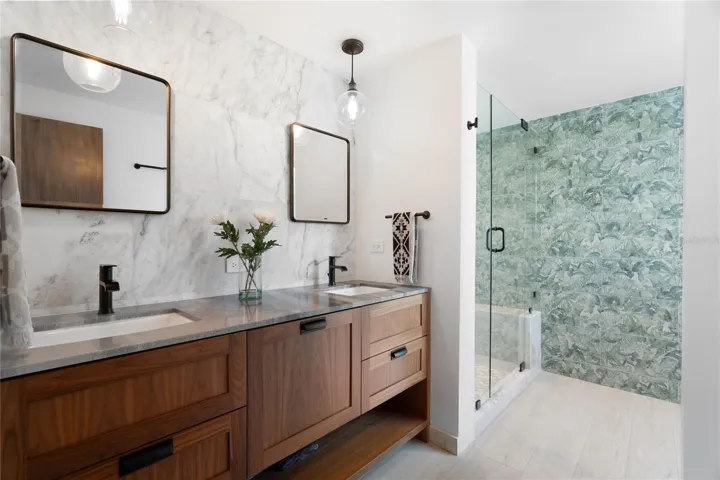 Upstairs, the primary suite features a spa-style bathroom with a floating tub, glass-enclosed shower, and dual vanity with integrated outlets. \r\n