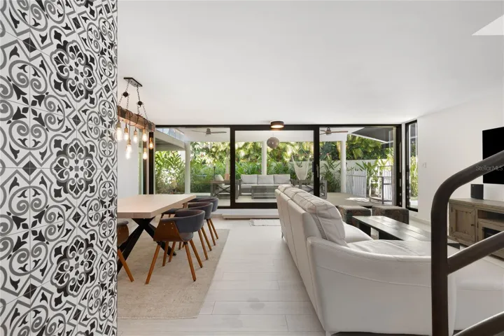 The adjoining dining area and living room connect through a 21-foot lift-and-slide glass wall, opening to the outdoor patio and creating one seamless space for gathering or unwinding.\r\n