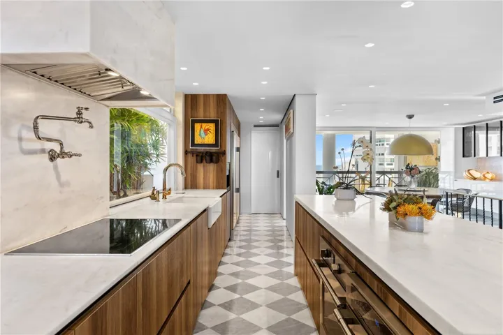 The kitchen is open and bright. It features Italian CopatLife cabinets, a center-piece island with impressive Avalon marble countertops, and top of the line appliances: Miele induction stove – with a real vented range hood –, built-in Miele coffee system, Frigidaire Professional microwave/oven combo and an additional convection oven, dishwasher, and side-by-side refrigerator and freezer. The Bar also has Avalon marble countertops and is equipped with a True refrigerator, an ice maker, and a temperature-controlled 378-bottle wine cellar.