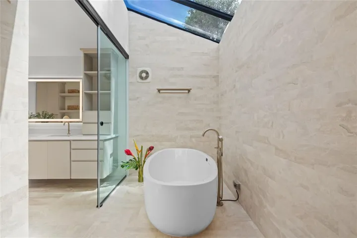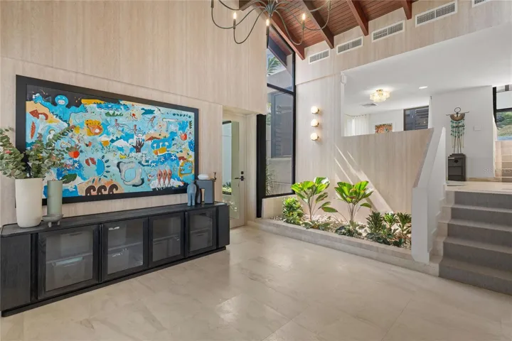At its core, the house is defined by light, air, and nature. It feels weightless, filled with sky. Expansive panes of glass and oversized windows bring the outdoors into every room, while skylights and a glass-roofed primary bath ensure daylight reaches even the quietest corners. The central interior garden, visible from every space–including the foyer, living areas, and primary suite–serves as a tranquil focal point, softening the modern architecture with layers of foliage, color, and light. \r\n