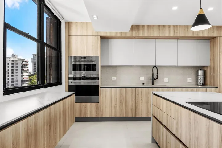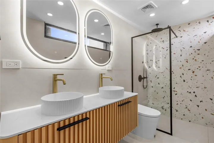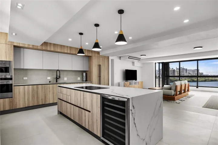 The kitchen is a true masterpiece of craftsmanship and functionality. Custom Italian cabinetry with in-line LED lighting pairs with Arklam sintered stone countertops, a premium surface capable of handling cookware straight from the oven. The integrated appliance suite is exceptional, featuring a fully integrated Liebherr Monolith refrigerator and freezer, SMEG oven, microwave, induction cooktop, and dishwasher, a Frigidaire wine fridge, and a Kohler sink.\r\n