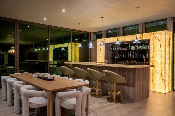 The home’s second-level expansion is a destination of its own, designed for world-class entertainment and elevated living. This level features a rooftop outdoor kitchen equipped with a Grillworks grill, beverage fridge, and ice maker; a stunning glass jacuzzi with panoramic ocean and fairway vistas; and an expansive sunken lounge ideal for gatherings or nightlife experiences. Additional amenities include a backlit marble bar accented with Baccarat lighting, an upstairs bar, a temperature-controlled wine cellar, cigar humidor, dedicated office, and a half bathroom. A fully equipped media room with sound-paneled walls and a kitchenette with Wolf induction cooktop provides the perfect environment for cinema, gaming, education, or studio use. Also located on this level is a complete in-law/guest suite offering a kitchenette, custom Italian closets, soaring ceilings, and a spa-quality marble bathroom with a freestanding porcelain tub.