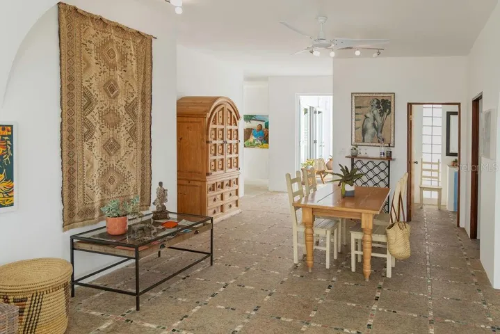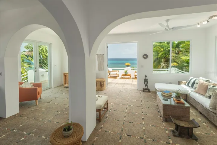 The art deco style villa elegantly mixes Mediterranean and Caribbean architecture. It’s distinct blue dome has become iconic of the North Shore skyline. The most spectacular space is the upper level apartment which has a unique European vibe with its stone mosaic floors, cathedral-esque arches, and grecian style louvered cabinets. The back drop from the main living space and the large outdoor lounge are the magnificent pool and turquoise ocean. Some of the spaces best features are the exterior bathroom and the amazing rooftop duomo with views of the mainland, Palomino and Culebra. Its doric columns frame the spectacular sunrises and sunsets during the morning and evening hours and the ferries can be seen as they come and go during the days.