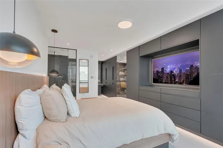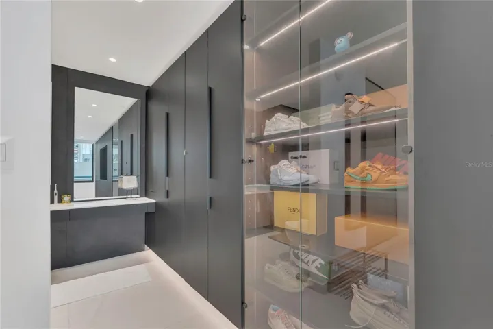 The custom walk-in closet is a true design statement, combining sleek aesthetics with smart, efficient organization.