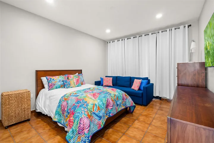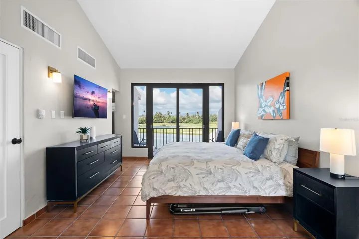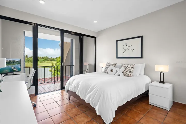 The main living level includes a living room, dining area, and kitchen, opening to a balcony/terrace overlooking the lake with partial gulf views. This level also offers two additional bedrooms, a full bathroom, and a laundry room. The upper level is dedicated to the primary bedroom, featuring access to a private rooftop terrace, ideal for enjoying the surrounding views.
