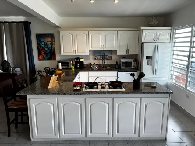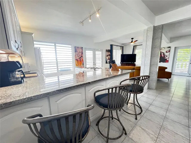 The top level has the primary bedroom and bathroom both being very spacious. The bathroom is newly renovated with beautiful concrete counters, contemporary fixtures and contemporary tiles. The upper level with primary bedroom is the main gathering area with a large open concept living area featuring panoramic ocean views from inside as well as from the oversized wrap around balconies. The very large kitchen is functional and has contemporary kitchen cabinets and beautiful granite counter tops. The cook top has six burners and is gas.