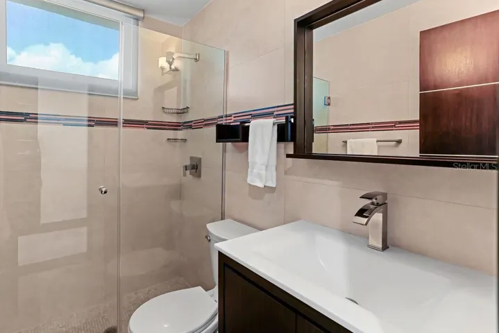 The primary suite is a private retreat, featuring a custom steam shower with multifunction heads, plush carpeting, a walk-in closet with its own refrigerator, motion-sensor lighting, dedicated hot-water heater, and a luxury smart toilet with bidet, heated seat, auto-open, and nightlight features.