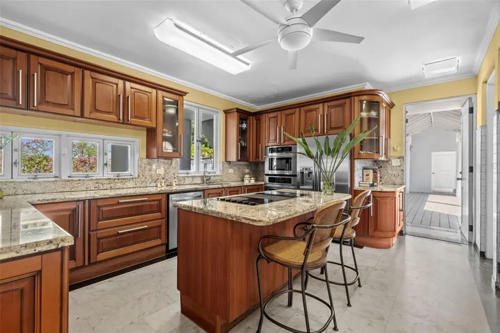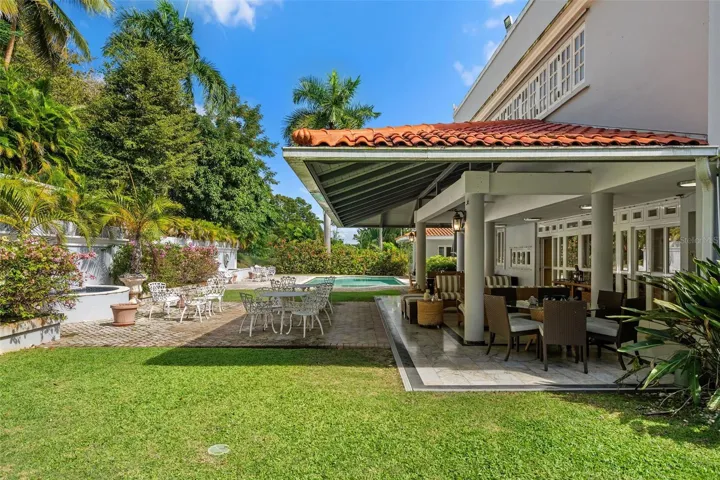 And then there’s the outdoors, the true soul of this property. The expansive backyard feels like a private park, surrounded by mature trees and lush landscaping. The pool sits at the center, framed by flowering trinitarias and carved stone fountains that bring a gentle, resort-like calm. With so much open green space, there’s room to dream bigger; perhaps a pickle ball court, a playground, garden paths, or future additions tailored to your family’s evolving lifestyle.