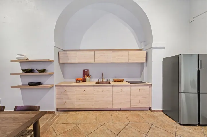 This beautifully maintained apartment features approximately 1,400 square feet of interior living space plus an expansive 600+ square foot private terrace patio with a tranquil pond and lush surrounding vegetation — a rare outdoor oasis in Old San Juan.