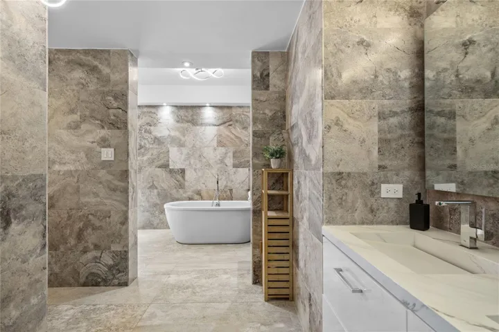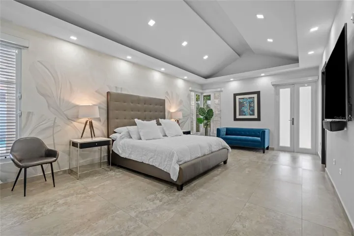 Outdoor amenities include a heated saltwater pool with waterfall, extended terrace, full outdoor kitchen with Built-in BBQ with Masonry Exhaust Hood , stove, ice maker, 85” outdoor Frame TV, and a private artificial turf putting green. The home also includes a Control4 smart home system, integrated sound system, and two wine refrigerators.