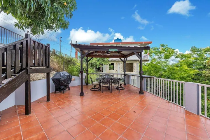 From the moment you step through the gated entrance, flanked by towering mango trees that give this retreat its name, you know you’ve found something special. The property is set on a generous, beautifully maintained lot with mature tropical trees, open lawn areas, and multiple private decks on every level — perfect for morning coffee with ocean breezes or evening sunset gatherings. A covered outdoor lounge with a grill gazebo completes the ultimate Caribbean entertaining setup.