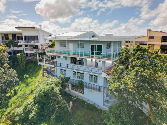 HOLLYWOOD HILLS — JUST 10 MINUTES FROM THE SAN JUAN METROPOLITAN AREA — Private hillside estate with extraordinary 180-degree panoramic views spanning the south, west, and north horizons. This custom-built three-level residence offers a rare combination of privacy, versatility, and breathtaking natural scenery. The main upper-level residence features approximately 1,470 square feet of living space with a 3-bedroom, 2-bath layout. Expansive glass openings and a wraparound balcony capture sweeping mountain and sky views while allowing abundant natural light and seamless indoor–outdoor living. The lower level includes a fully independent 2-bedroom, 1-bath guest residence with a private terrace, ideal for extended family, guest accommodations, executive retreat use, or potential income-producing opportunities. Recently renovated with hurricane-resistant doors and windows, providing durability and peace of mind. Situated on an expansive 4,290-square-meter hillside lot, the property offers exceptional privacy and a unique topography that enhances its panoramic vistas. The land also presents opportunities for future expansion, terraced gardens, or customized outdoor living spaces.