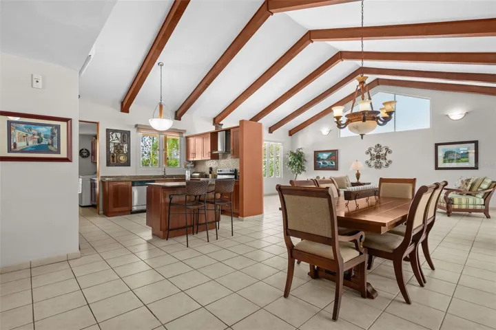 Inside, you’ll find bright and airy living spaces highlighted by soaring ceilings with exposed wood beams and an open layout ideal for both everyday living and entertaining. The kitchen features rich wood cabinetry, granite countertops, stainless steel appliances, and an island with seating that connects seamlessly to the main living areas.