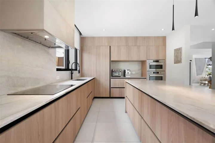 The kitchen stands out with Bertazzoni appliances and Quartzite Taj Mahal Leather countertops, complemented by a dry bar that adds to the home’s entertaining appeal. The outdoor space serves as a private retreat, featuring a terrace with a heated saltwater pool and jacuzzi, along with an outdoor kitchen and BBQ area.