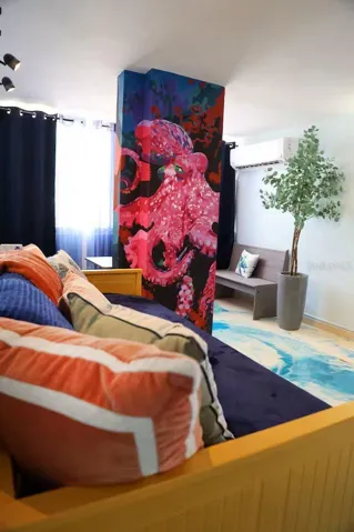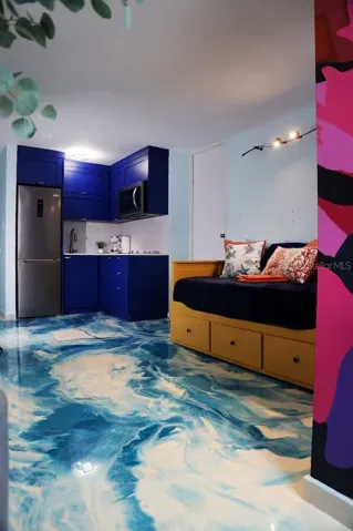 One or more photo(s) has been virtually staged. Located in the heart of Condado’s tourist district, this beautifully remodeled and fully furnished unit at The Diplomat is a turnkey investment opportunity. Short-term rentals (Airbnb) are permitted — cross the street and you’re at the beach. The unit features a custom ocean-inspired epoxy floor, original artist mural, cobalt blue kitchen with stainless steel appliances, and a premium marble bathroom with matte fixtures. Building amenities include a pool and elevator. HOA of $148/month includes water. Move in or start earning from day one — everything stays.