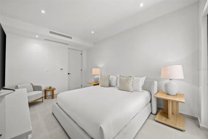 The thoughtfully planned layout supports both everyday comfort and effortless entertaining. Each bedroom offers generous proportions, custom Italian closet systems, and direct access to private louvered patios that invite natural light and cross-ventilation while maintaining privacy. Electric shades throughout the home add convenience and a cohesive, contemporary aesthetic.