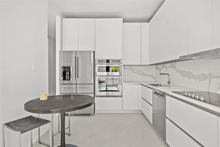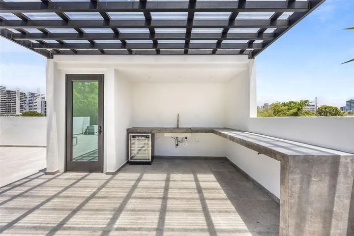 A private rooftop patio expands the usable living space and is perfect for open-air dining and entertaining. This elevated retreat includes a built-in cement dining table, sink, and wine fridge, creating a functional outdoor kitchen and lounge environment.